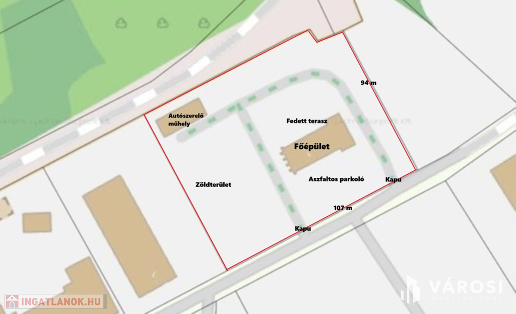 A terület körülbelül egyharmada zöld terület, amely fasorral van elkülönítve a főépülettől, így szabadtéri rendezvények megszervezésére is alkalmas, vagy további fejlesztések alapját képezheti. Az ingatlan teljesen körbe van kerítve beton és fém kerítéssel, három bejárattal rendelkezik, amelyek lehetővé teszik a gépjármű forgalom megfelelő szervezését. A főbejárat elektromos kapuval van ellátva.
