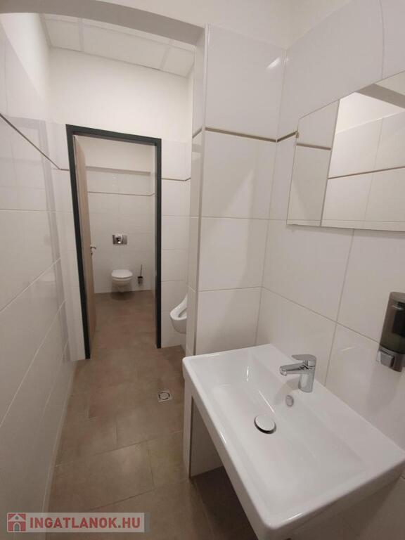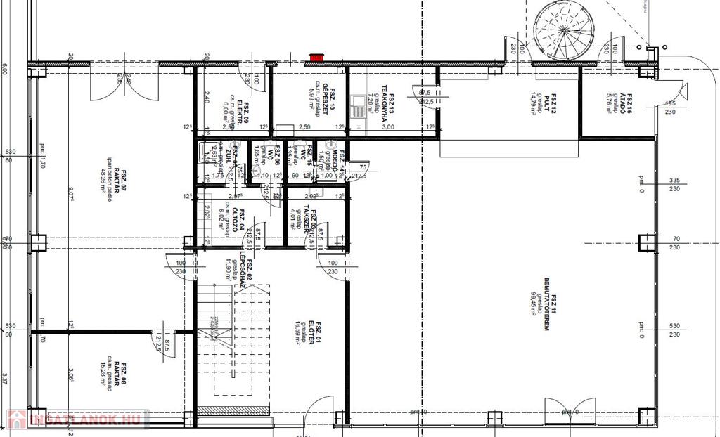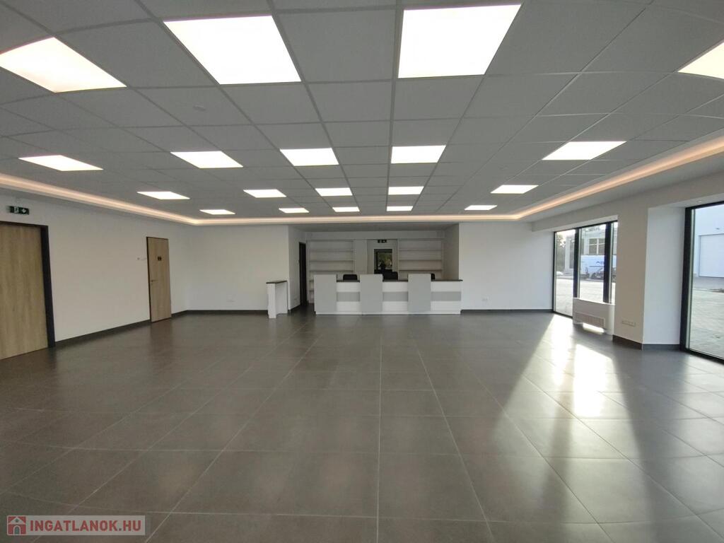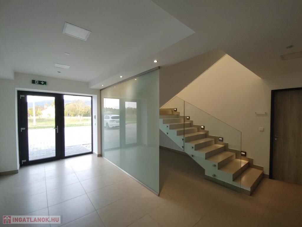 Az irodaházba bejutás a térkövezett kültéri parkolóból egy 100 nm-es bemutatótermen keresztül történik. A földszinten további helyiségek állnak rendelkezésre összesen 187 nm nettó alapterületen. A kisebb raktárokon túl megtalálható szociális helyiség, konyha, gépészet, szerverszoba is.
