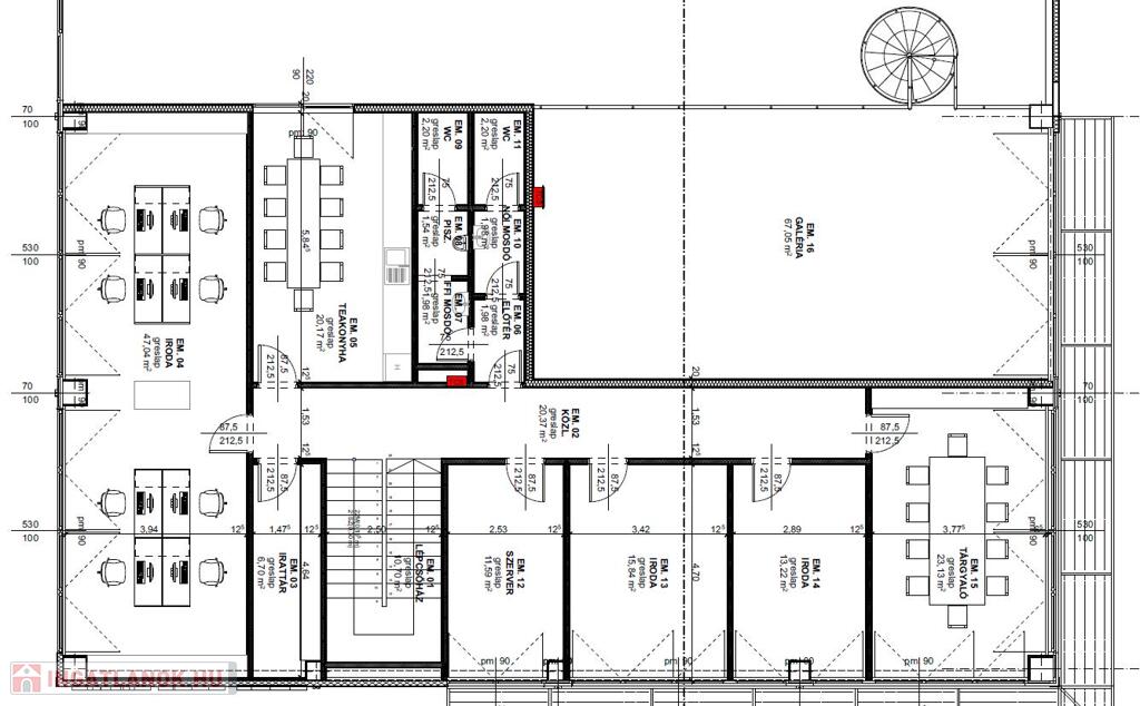 Az irodaház és a csarnok ablakkal is összekötött, valamint egy 67 nm-es nyitott galéria további raktározási lehetőséget vagy munkaállomás kialakítását teszi lehetővé.