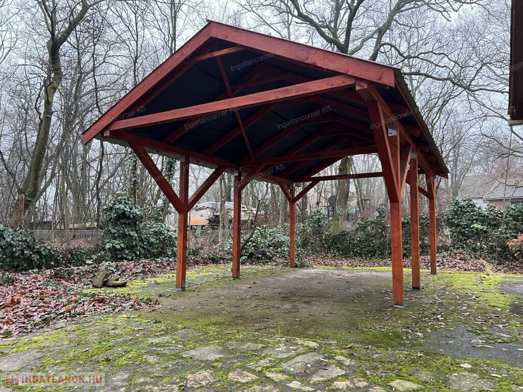 A csendes, madár csicsergős telken, épült fedett kocsi beálló is, mely akár több módon hasznosítható.