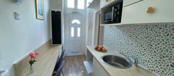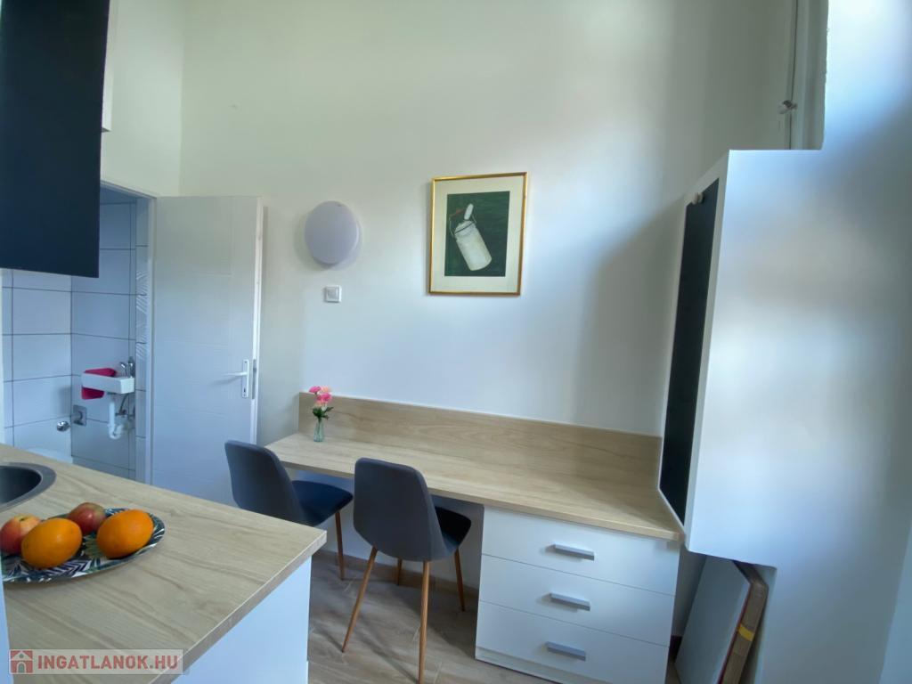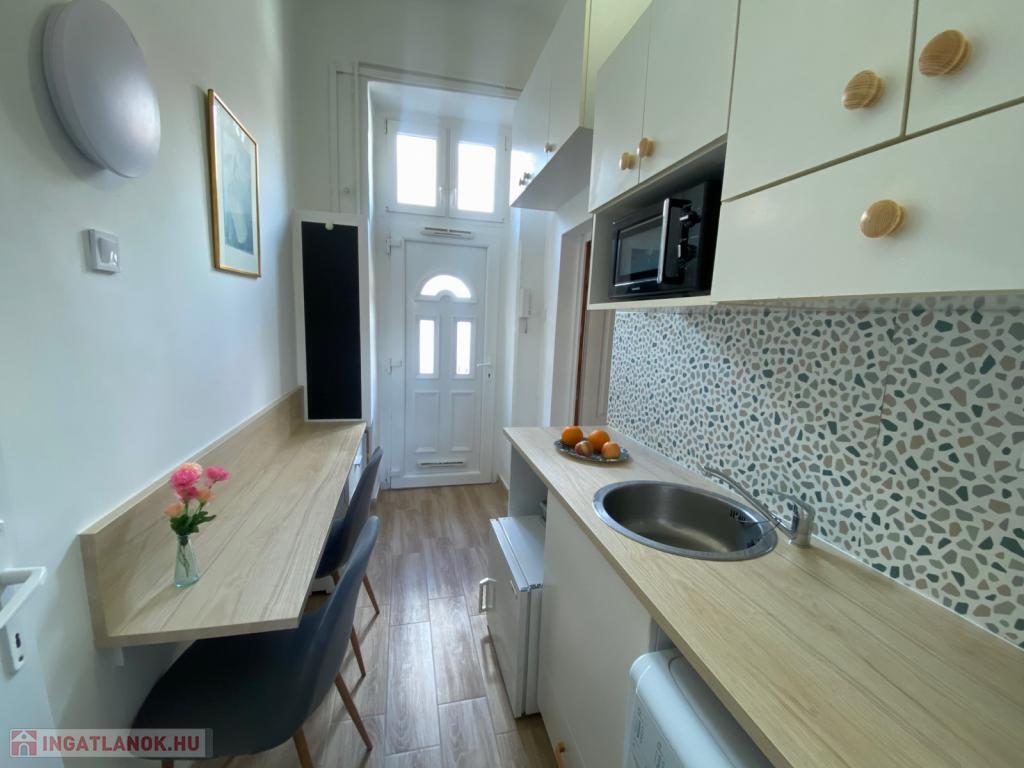 A lakás felújított állapotú, kis méretű, gépesített konyhával rendelkezik