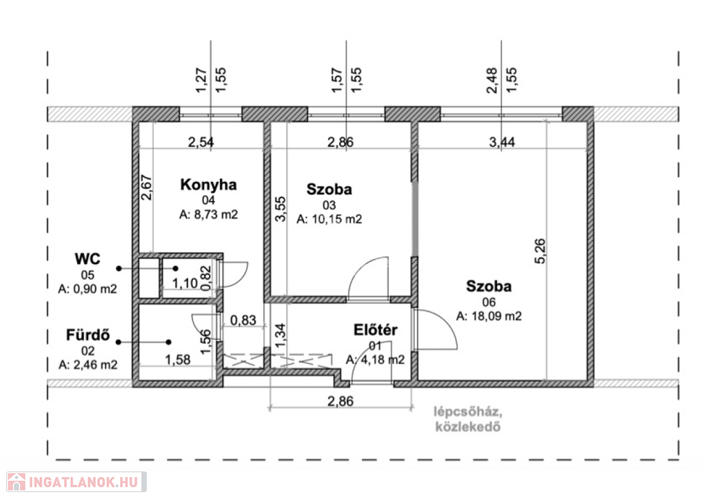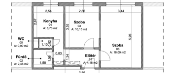 Helyiségei: előszoba, konyha, nappali, szoba, fürdőszoba, WC.
