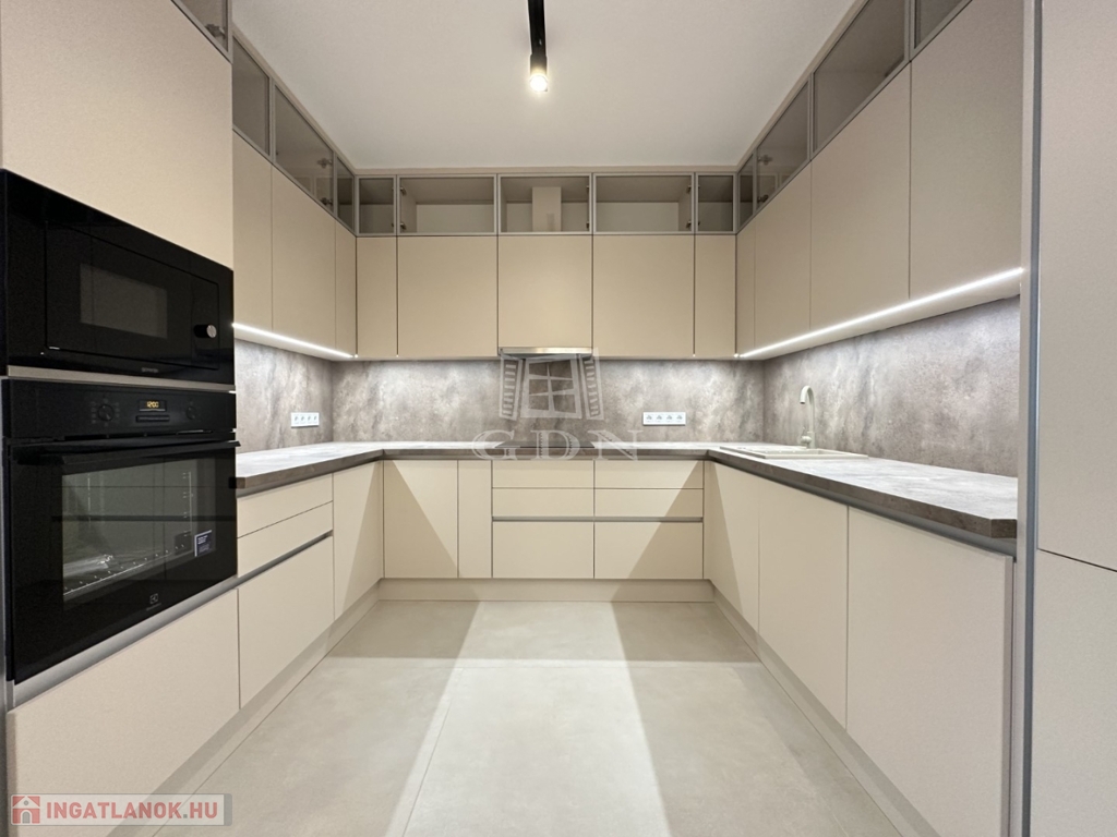 A beépített bútorok modernek, igényesek, a konyha gépekkel (kombi hűtő, főzőlap, sütő, mikrohullámú sütő, elszívó, mosogatógép) felszerelt.