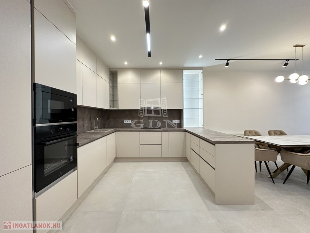 A beépített bútorok modernek, igényesek, a konyha gépekkel (kombi hűtő, főzőlap, sütő, mikrohullámú sütő, elszívó, mosogatógép) felszerelt.