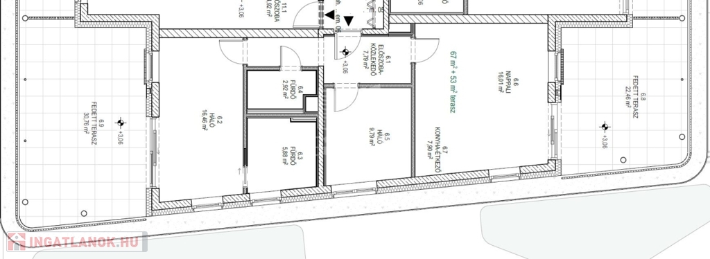 Ez a lakás nappali+2 hálós, 67nm alapterületű+ tartozik hozzá két (22nm+31nm) összesen 53nm fedett terasz is.