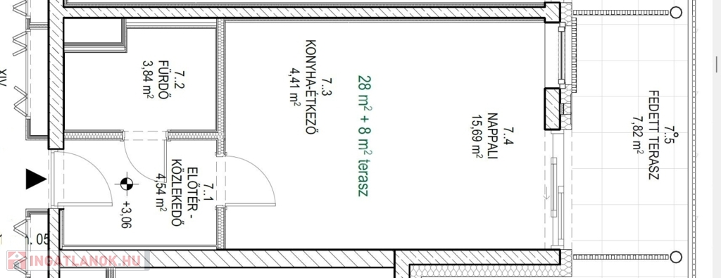 Ez a garzonlakás 28nm alapterületű+ tartozik hozzá egy 8nm-es fedett terasz is.