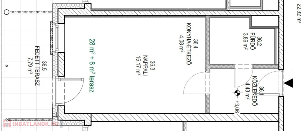 Ez a garzonlakás 28nm alapterületű+ tartozik hozzá egy 8nm-es fedett terasz is.