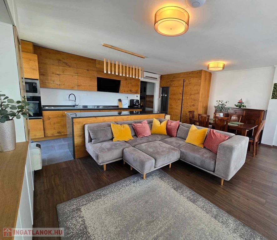 A 83 m²-es ingatlan praktikus elosztású: tágas, közel 40 m²-es nappali–konyha–étkező, 2 külön nyíló hálószoba, fürdőszoba, valamint külön vendég WC biztosítja a kényelmes mindennapokat. A nappaliból nyíló, 26 m²-es fedett teraszról gyönyörű panoráma nyílik a Balatonra és a Tihanyi-félsziget irányába.