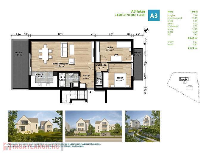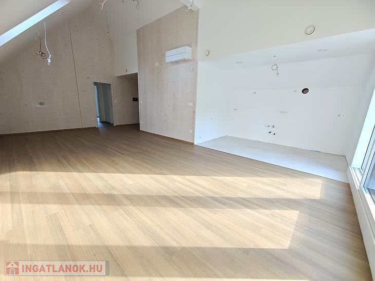 Az eladásra kínált lakás a társasház legfelső lakása, mely amerikai konyhás nappaliból, 2 hálószobából, fürdőszobából és külön wcből áll. A hálószobákból nyílik egy 5nm-es erkély, illetve a nappaliból nyílik egy 16nm-es napfényes terasz. A lakás ugyan tetőtéri, de a tervezéskor gondoskodtak a jól bútorozhatóságról, ezért a térdfal 1,70cm.