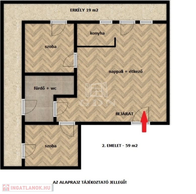 2. EMELET: 59 m2 – 3 szoba – 1 fürdő – TERASZ: 19 m2