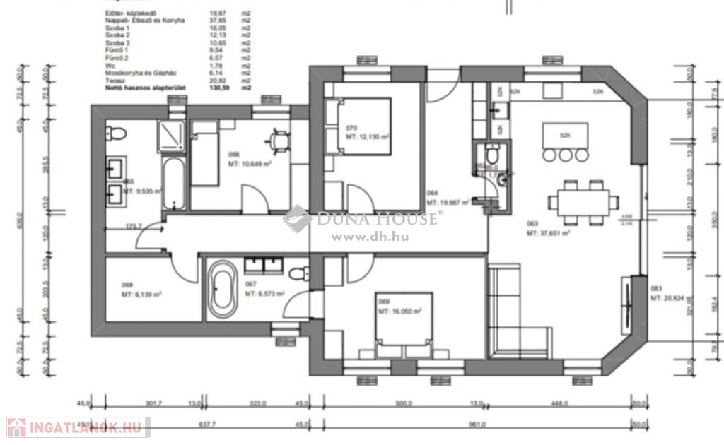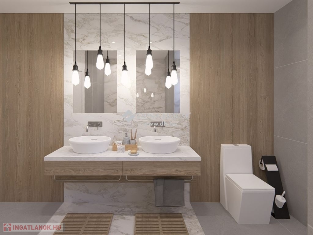 Az ingatlan az alábbi helyiségekből áll: panorámás nappali + konyha, 3 szoba, előszoba, 2 db fürdő +wc, lépcsőtér, erkély, háztartási helyiség.