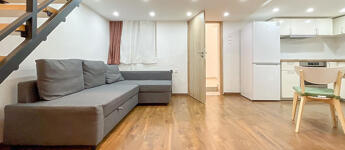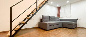 A lakás alsó szinten tágas előszoba, zuhanyzós fürdőszoba és amerikai konyhás nappali található, ahonnan privát, lichthofból kialakított terasz-rész elérhető. Az emeleten dolgozónak kialakított hall-rész, hálószoba.