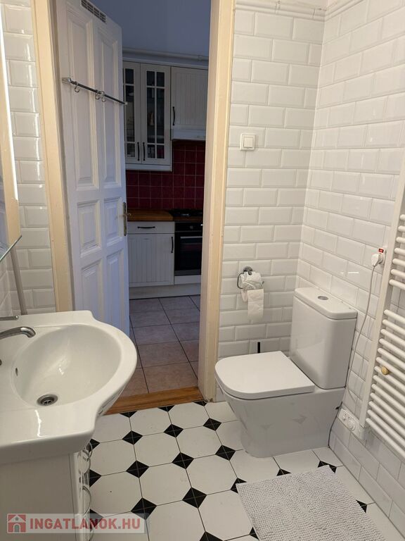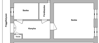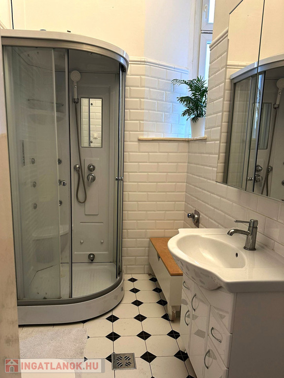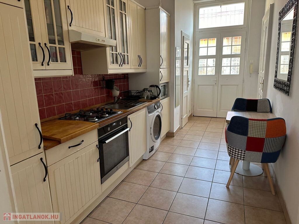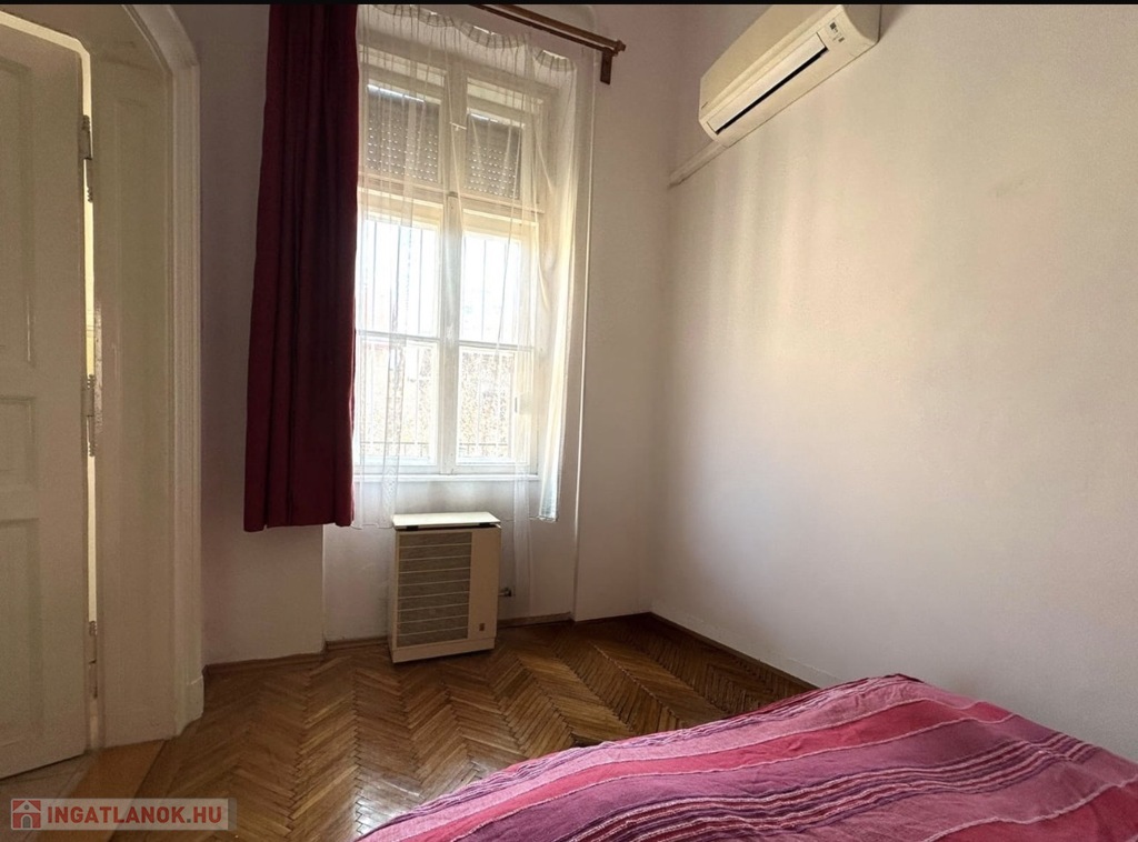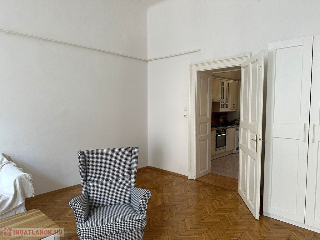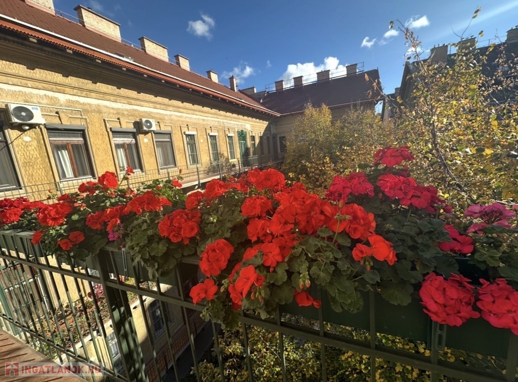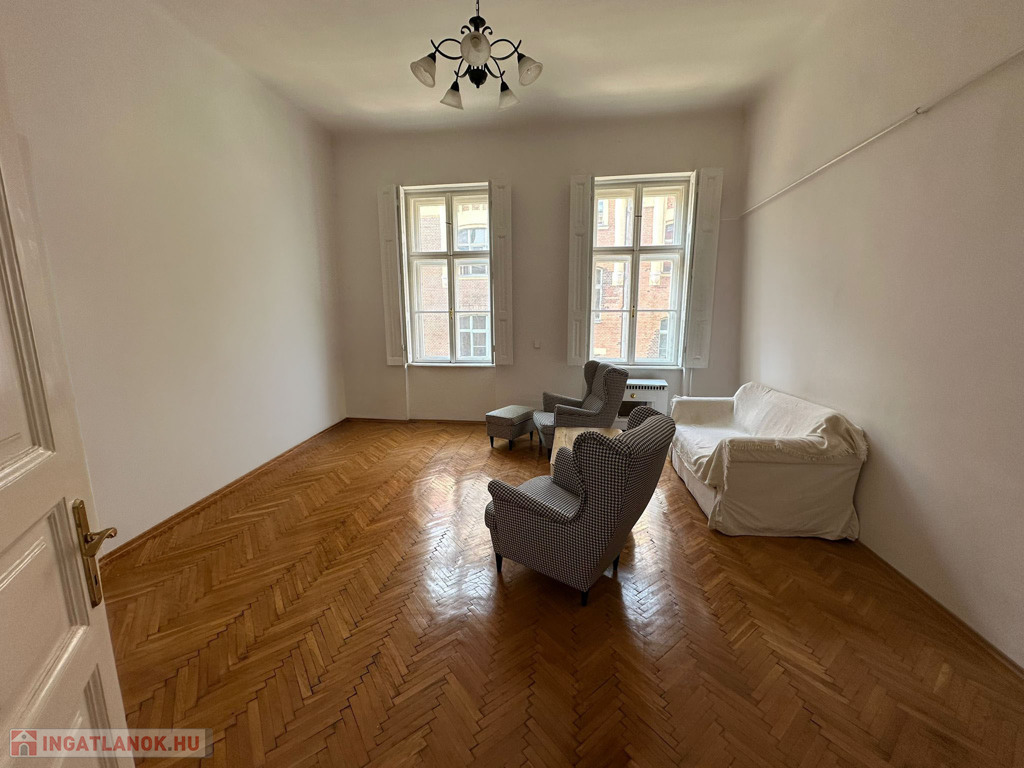 A lakás két külön nyíló szobás, elrendezése jól alakítható, a nagy belmagasság pedig galéria kialakítására is lehetőséget ad. A belvárosi elhelyezkedés ellenére kifejezetten csendes: a kisebbik szoba egy zöld, fás udvarra néz. A körfolyosó itt véget ér, így nincs átjárás a lakás előtt – ez ritka nyugalmat biztosít, és akár egy kis balkonkert kialakítására is alkalmas. Az ingatlan a második emeleten található, az épületben nincs lift.