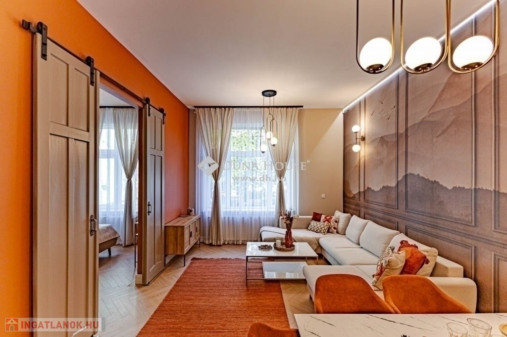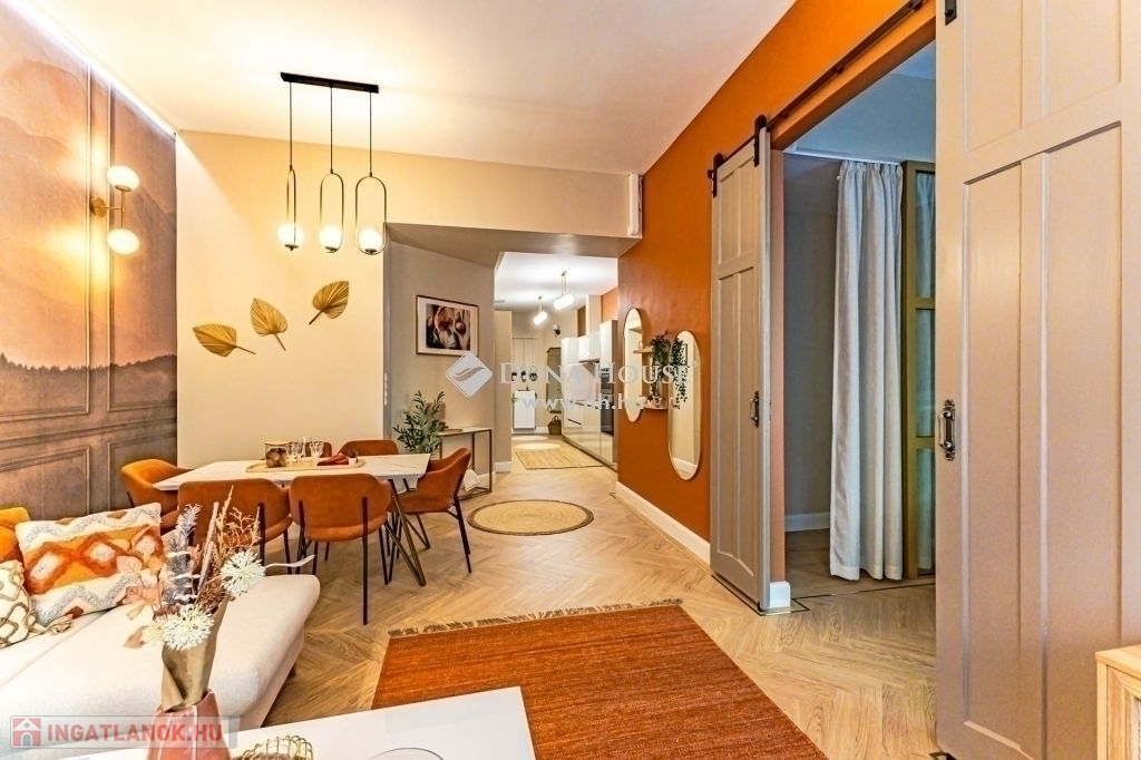 . A lakás tulajdoni lap szerint 92 nm melyet két lakássá bontottak, ennek eredménye, egy közel 75 nm, és egy 18 nm alapterületű lakás került kialakításra. Jelen hirdetésben szereplő 75 nm lakrészt kínáljuk eladásra.A lakást, a mostani tulajdonos az alapokig visszabontotta, és minden elemében megújította. Ennek köszönhetően, két hálószoba és tágas nappali került kialakításra.A terekre jellemző, hogy a mind a fő mind a második hálószoba is közel 15 nm; a fő hálószobából leválasztottak egy Gardrobe helyiséget. A nappali tágas világos, magában foglalja az étkezőt is, a konyha a tágas közlekedő részen kapott helyet, ahonnan a Fürdő és az udvari tájolású hálószoba is megközelíthető.A felújítás során magas minőségű anyagok kerültek beépítésre, mind a szaniterek, mind a nyílászárók tükrözik azt az igényességet, amelyet a Home Staging során kiválasztott bútorok és berendezési tárgyak egészítenek ki és teszik harmonikus otthonná. A lakás teljes bútorzattal, és berendezési tárgyakkal együtt megvásárolható.A házban a rövidtávú kiadást mostani tudásunk szerint a ház nem engedélyezi, a kisebbik lakrész jelen pillanatban is ki van adva hosszú távra. Igény esetén az is megvásárolható, külön megállapodás alapján.Jöjjön el nézze meg.