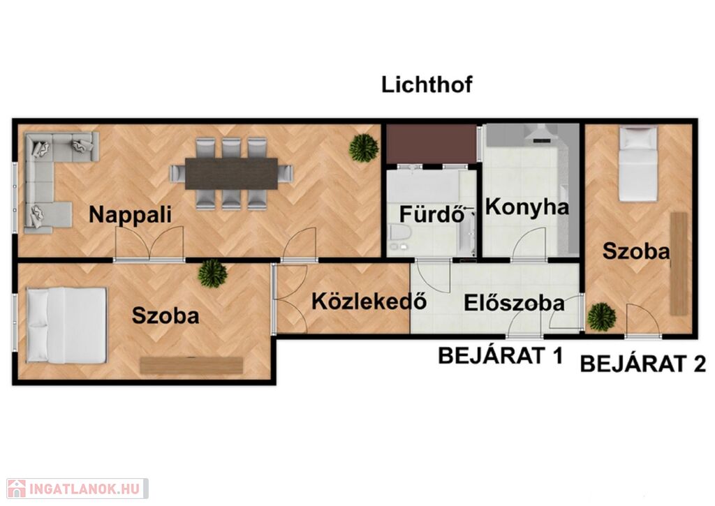 -92m2-es lakás(nappali, 2 lakószoba,fürdőszoba, konyha, előszoba és közlekedő)