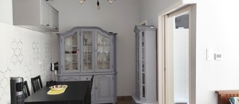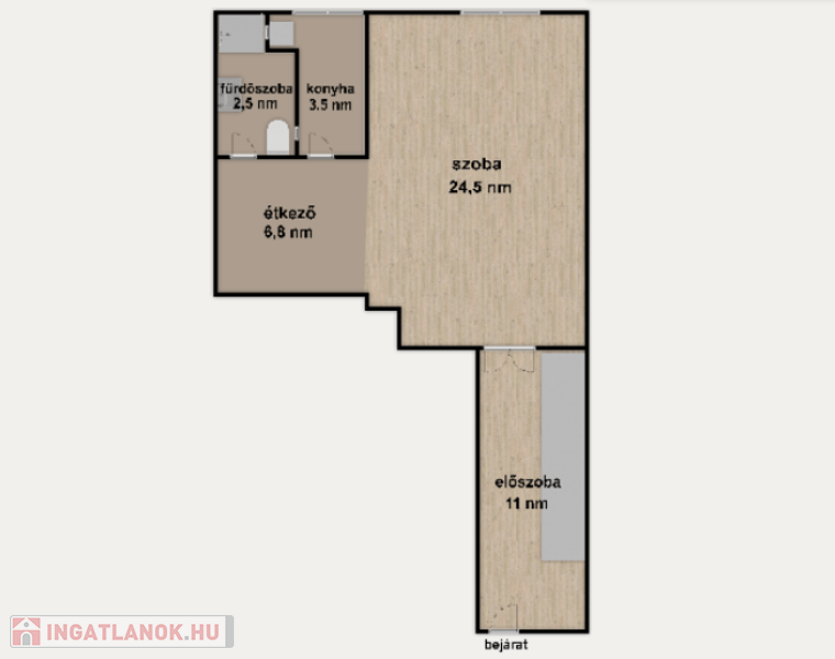 Az ingatlan bejárata a függőfolyosóról nyílik. Viszonylag nagy méretű előszobájában hatalmas gardróbszekrény került elhelyezésre. Az előszobán végighaladva a tágas szobába jutunk, amely jelenlegi nagyságát az egykori hallal történő egybenyitásával nyerte el. A szobából nyíló beugróban kapott helyet a sok tároló hellyel rendelkező, praktikus étkező. Innen közelíthető meg a kicsi, de jól felszerelt , nagy ablakos konyha és a zuhanyzós kialakítású fürdőszoba.