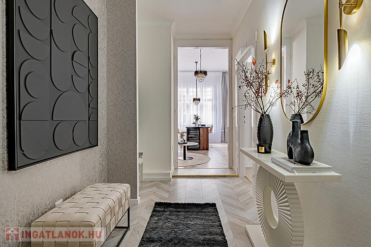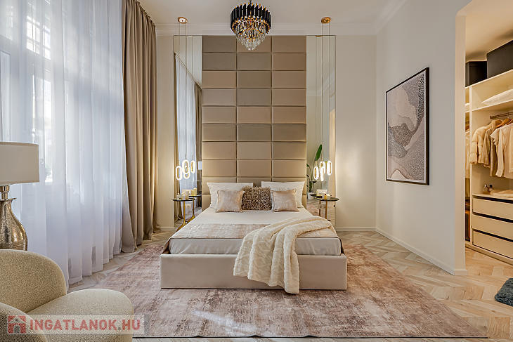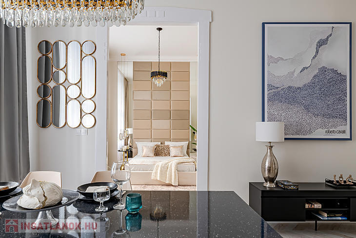 A lakás lakberendező által tervezett: amerikai konyhás nappali, tágas háló gardróbbal és saját walk-in zuhanyzós fürdővel, előtér és külön WC. Eleganciáját exkluzív Roberto Cavalli dekor emeli. Tároló is tartozik hozzá.