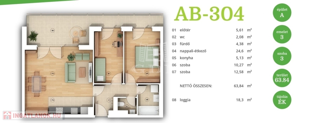 Ez a lakás nappali+2 hálós, 64nm alapterületű és tartozik hozzá egy 18nm-es terasz is.
