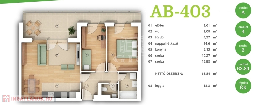 Ez a lakás nappali+2 hálós, 64nm alapterületű és tartozik hozzá egy 18nm-es terasz is.
