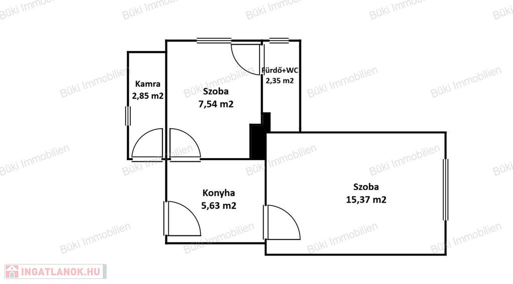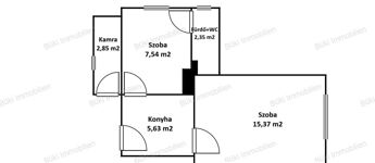 A bejáraton belépve egy praktikus előtér és konyha fogad, ahonnan két irányba nyílik az élettér. Az egyik egy meghitt félszoba, amely tökéletes hálónak – egy olyan hely, ahová valóban jó visszavonulni. A másik a tágasabb szoba, ahol nappalit alakíthat ki, vendégeket fogadhat, vagy egyszerűen csak élvezheti a saját terét. A fürdő a hálóból nyílik, ami egy kifejezetten intim, otthonos elrendezést ad az egész lakásnak.