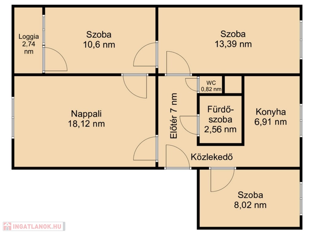 A lakásba belépve a több ponton záródó biztonsági bejárati ajtón keresztül a két irányban járható 7 nm-es járólapos előszobába érkezünk, ahonnan az összes szoba és helyiség nyílik. Az előszobából egyből jobbra is és balra is egy-egy szoba nyílik. A bejárati ajtóból balra fordulva a minőségi laminált parketta burkolatú, több mint 18 nm-es, Polar márkájú klimatizált nappaliba lépünk, melyből egy gyerekszobának vagy hálószobának is alkalmas 10,6 nm-es ugyanolyan parkettás szoba nyílik, végében a hangulatos, parkra néző loggiával. Ez a szoba a másik, vele szemben álló 13,4 nm-es, szintén laminált parketta burkolatú hálószobával is egybenyílik, illetve a közlekedőből is ajtókapcsolatos. Innen a bejárat felé visszamenve a közlekedő jobb oldalán a járólapos és csempézett WC és a szintén járólapos és csempézett 2,6 nm-es fürdőszoba következik. A bejárati ajtó mellett a konyha előtt a közlekedőben jobbra fordulva a negyedik, 8 nm-es járólap burkolatú szobát találjuk. A közlekedő végében pedig az étkezős, igényes, fekete és fehér színnel kombinált beépített konyhabútoros, 4 lángos gáztűzhelyes, ablakos, világos, járólapos, 7 nm-es konyhába kerülünk.