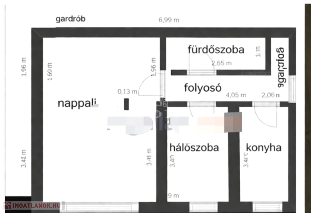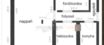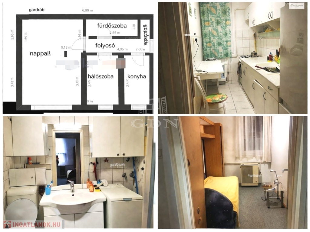 Elosztás: előszoba, gardrób, nappali, hálószoba, étkezős konyha, fürdő + külön WC