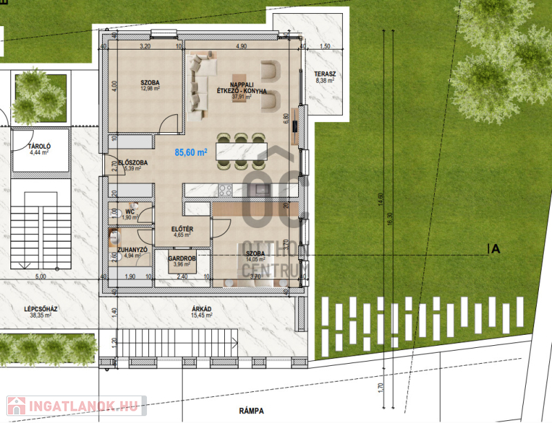 Ez az ingatlan a földszinten helyezkedik el, 86 m2 alapterületű + 8 m2 terasz + 100m2 udvar tartozik hozzá.