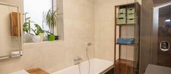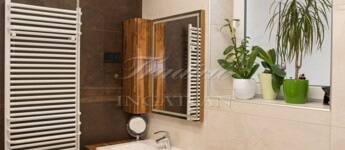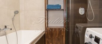 • Fürdőszoba és külön WC: mennyezetig érő greslap burkolat, kád és zuhany, elektromos padlófűtés, kombinált radiátor (elektromos vagy gázcirkó), egyedi, fűthető tükör, integrált szagelszívás.