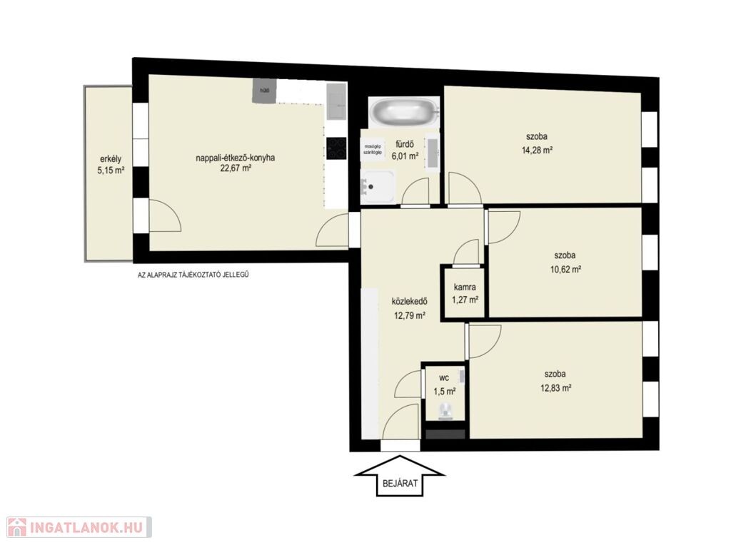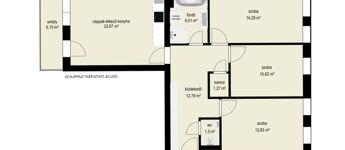 A lakás belső elosztása rendkívül praktikus: nappali-konyha-étkező, 3 hálószoba, kádas-zuhanyzós fürdőszoba, wc, kamra, előszoba, folyosó kialakítású.