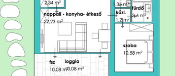 A 1 db amerikai konyhás nappalival, 1db hálószobával, 1 db fürdőszobával, közlekedővel, loggiával rendelkezik.