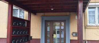 - Rendezett megjelenés: fa szerkezetű előtető, postaládák