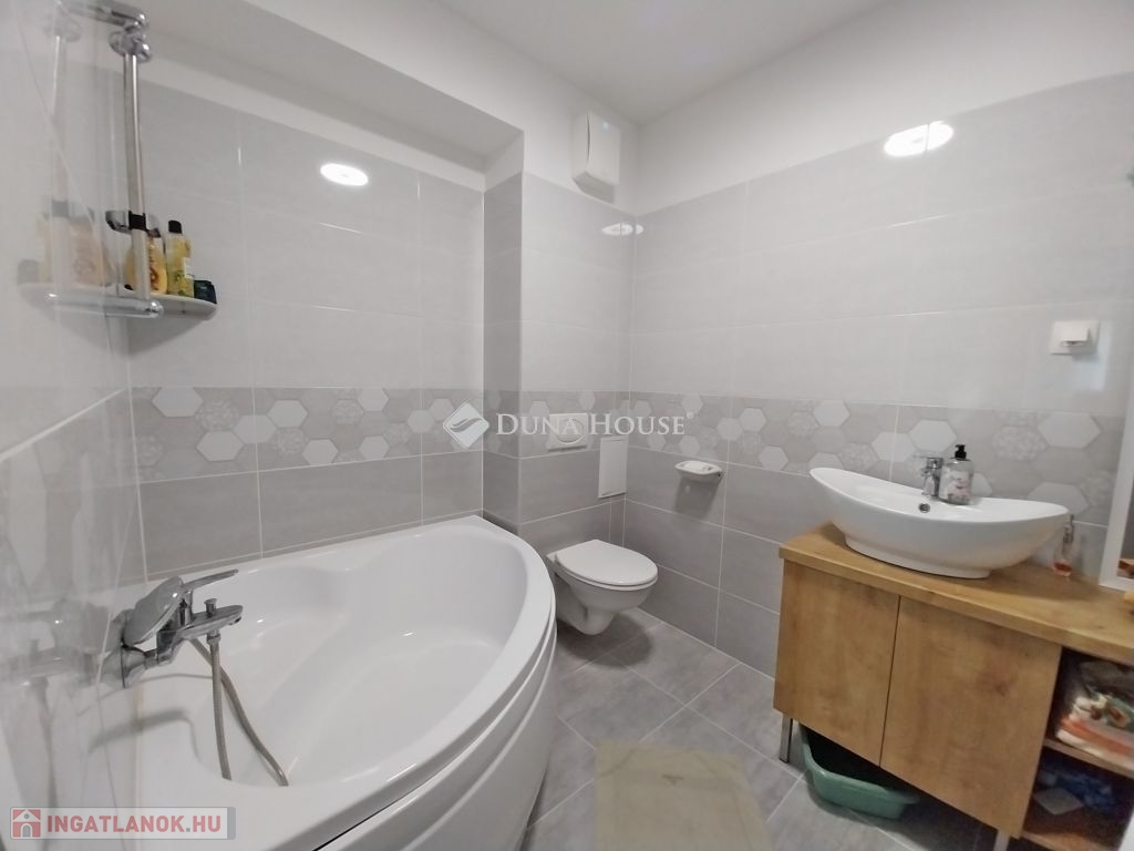 A tágas fürdőkbe sarokkád illetve zuhanykabin került beépítésre, a mellékhelyiség nem szeparált.