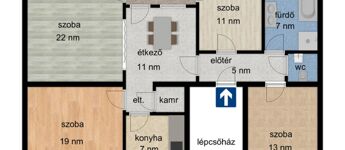 - Nappali-étkező, 3. szoba,konyha,fürdő,WC,kamra, erkély.