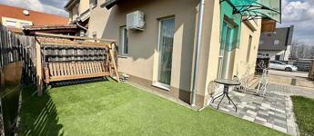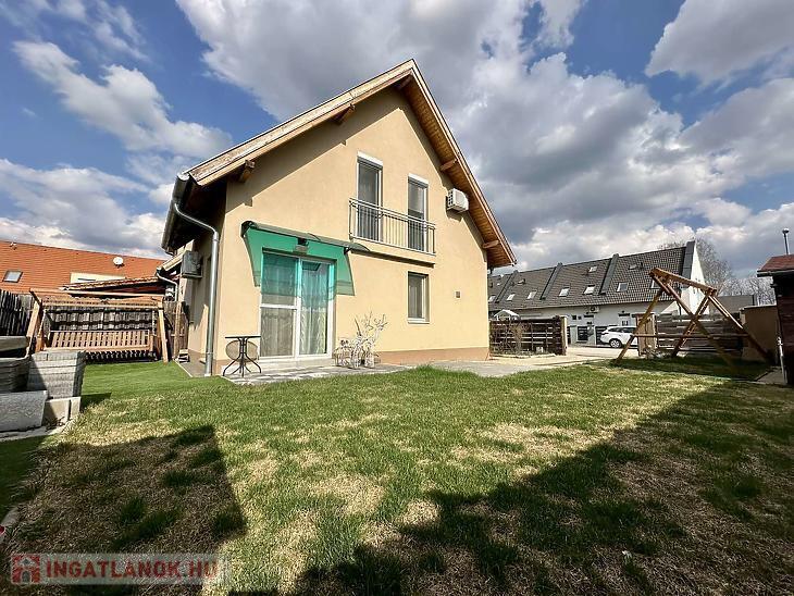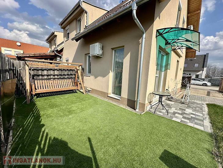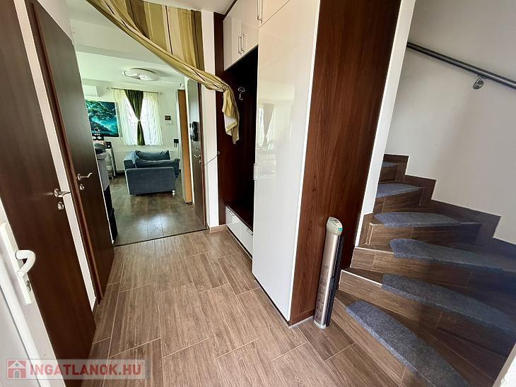 Az ingatlan remek elosztású: az alsó szinten egy tágas előszoba fogad, innen nyílik az amerikai konyhás nappali, 2 kamra, valamint egy vendég WC. A nappaliból közvetlen kijárat vezet a teraszra, valamint az elkerített saját kertbe.
