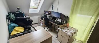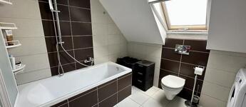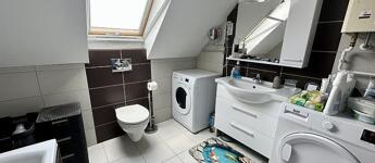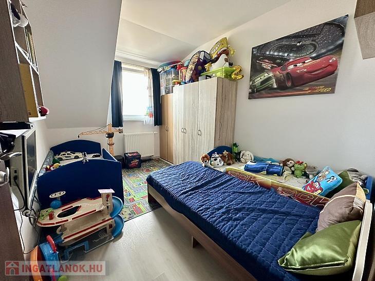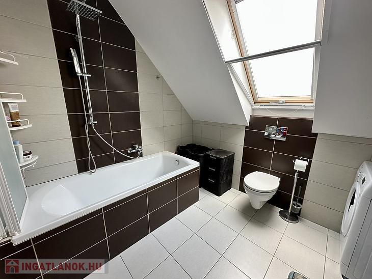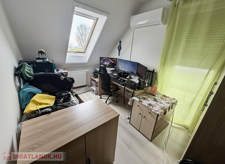 Az emeleti szinten három külön nyíló szoba, egy WC-vel ellátott fürdőszoba, valamint egy padlástér található, amely kiválóan alkalmas tárolásra. A lakás műanyag nyílászárókkal rendelkezik az alsó szinten, az emeleten pedig dupla üvegű fa nyílászárókkal van ellátva, minden ablak redőnnyel és szúnyoghálóval felszerelt, a fűtést kondenzációs gázkazán biztosítja radiátoros hőleadással, valamint három darab hűtő-fűtő klíma gondoskodik a komfortérzetről mindkét szinten. Az épület kiváló hang- és hőszigeteléssel rendelkezik (Silka falazat, 12 cm szigetelés), a lakáshoz pedig saját parkolóhely is tartozik, az udvarban 2 autónak van hely biztosítva, az utcán szintén további 2 hely biztosított parkolásra.