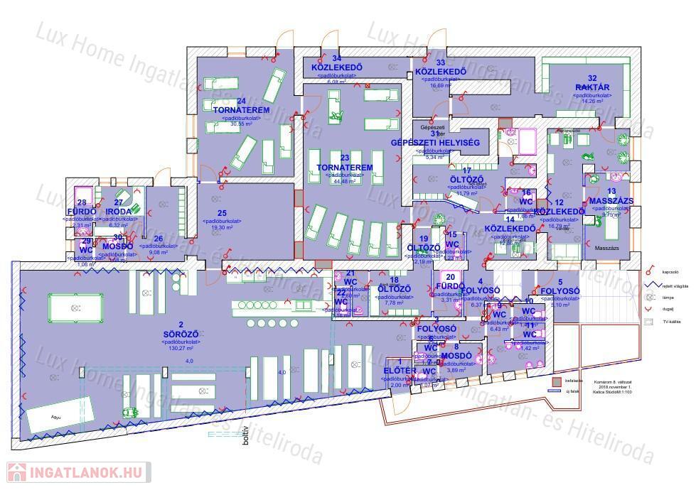 - Tornaterem, öltözők, zuhanyzók, irodák, raktár, masszázsszoba és vendégmosdók is találhatók benne.