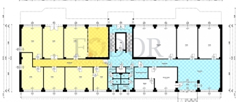 A XIII. kerület Angyalföld részén, a Topolya utcában kínálok kiadásra 8 db eltérő méretű irodahelyiséget összesen 190 m² alapterületen. Az ingatlan magában foglal egy mágneskártyával nyitható, privát, lezárt folyosót is. Az irodahelyiségek között gipszkarton falak választják el egymást, így könnyen alakíthatók. Az alaprajzon sárgával jelölt területek a kiadó irodák.