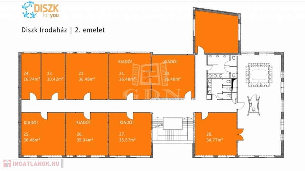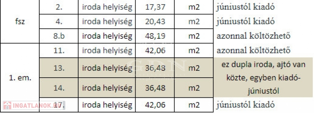 Minden irodához tartozik 2 db parkoló, közös terek, étkező használata, recepciós szolgáltatás, levél és csomagátvétel, internet benne van az árban.