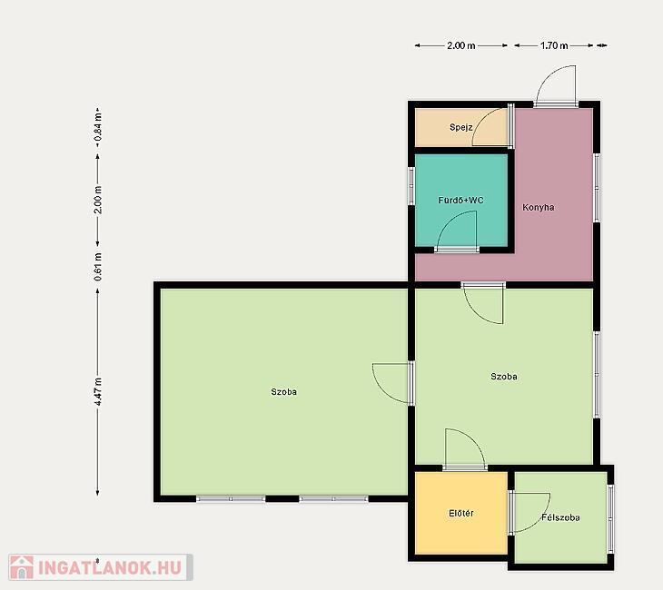 A földszinti rész 70 nm-es, 2 + 1 félszobás, közepes állapotú. Felújítása során több ablakot is kicseréltek újabb típusú, műanyag ablakra valamint klíma is beszerelésre került.