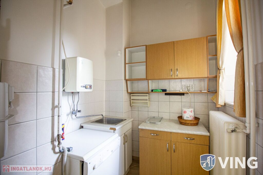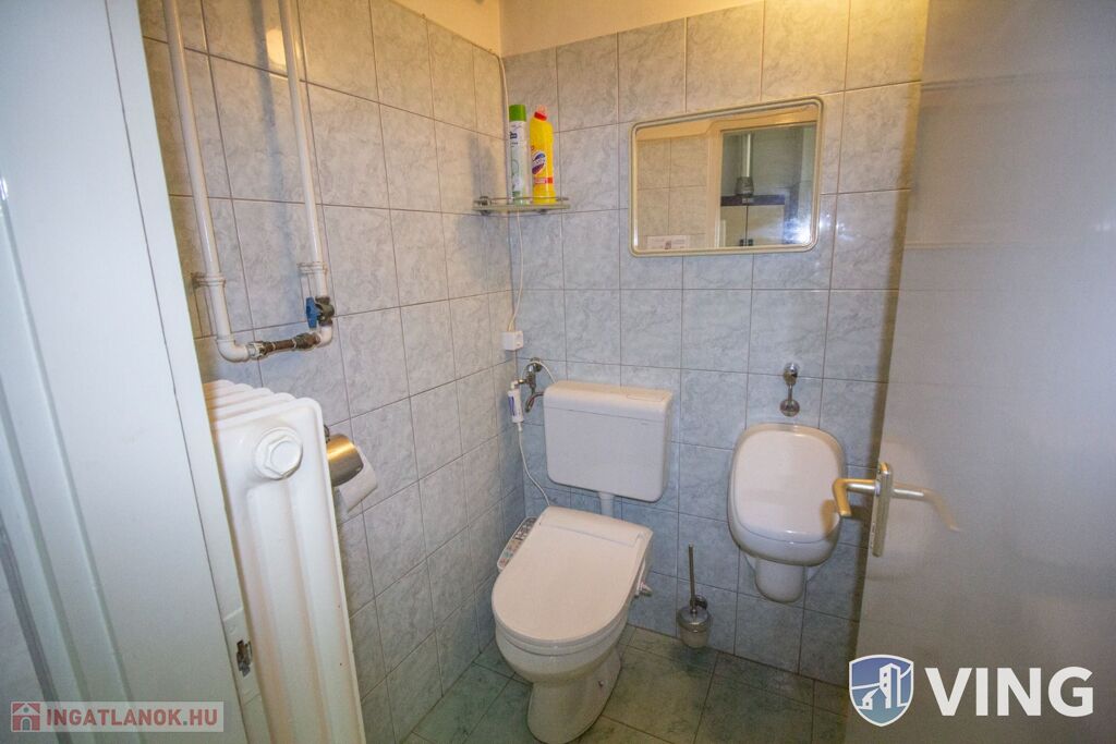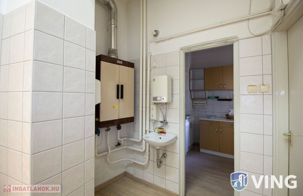 A klimatizált 96 nm-es nagyobb helyiség laminált burkolatú és a nagyméretű nyílászáróin szalagfüggöny lett felszerelve. Tovább haladva a folyosóról nyílik a teakonyha, ami mosogatógéppel felszerelt, és a felújított WC, mely egyben bidé is.