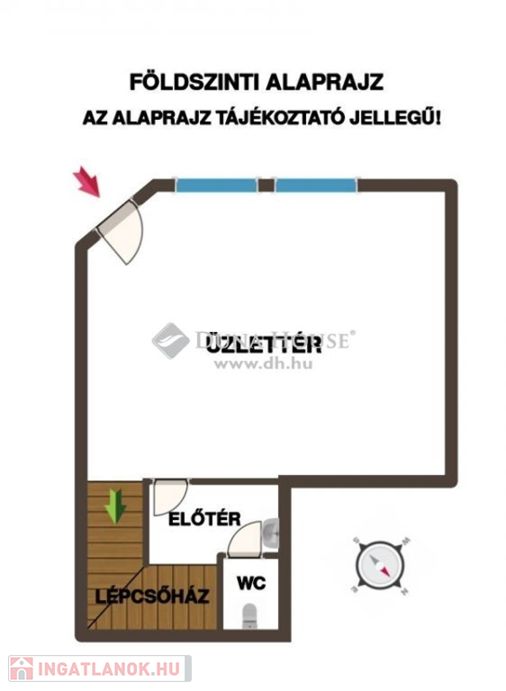 Az ingatlan földszintjén egy tágas üzlettér található, melyet egy előtér köt össze a WC-vel és a lépcsőházzal.