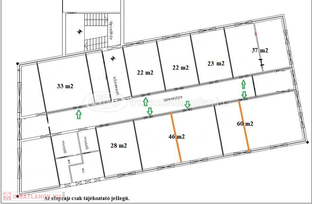 Az emeleten egészen 22 m2-től 60 m2-ig vannak még eladó irodák, üzlethelyiségek.