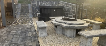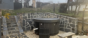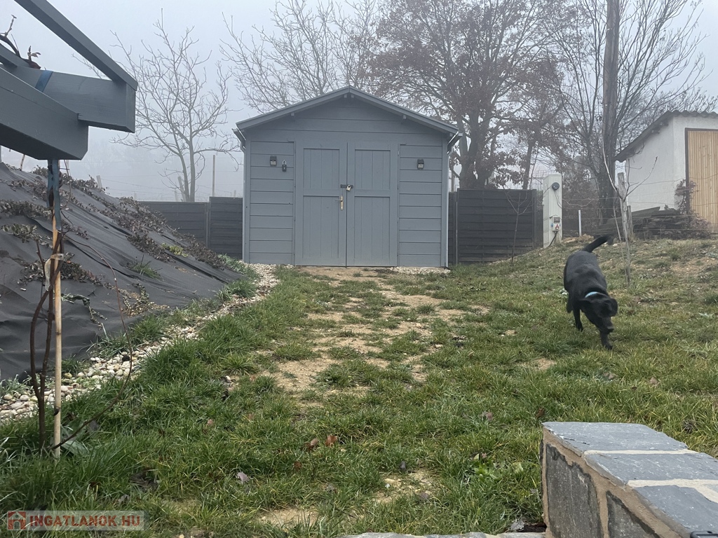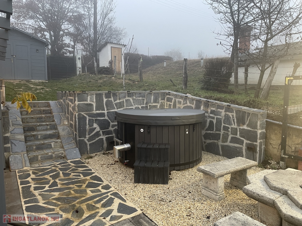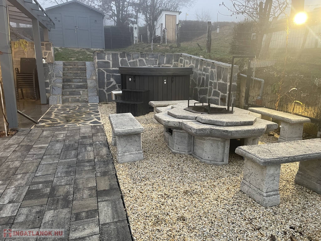 A ház mellett kialakított exkluzív kerti pihenőtér a nyári esték tökéletes helyszíne: fedett terasz, fatüzelésű dézsa jakuzzi funkcióval, valamint hangulatos Jován XXL tűzrakóhely szolgálja a kikapcsolódást. A kertben egy 9 m²-es szerszámos ház is helyet kapott.