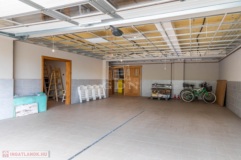 A 195 nm-es nettó alapterületű fűtött alagsorban található egy 85 nm-es egylégterű garázs, melyben 4 autó vagy akár 2 autó és 1 kisebb méretű hajó is kényelmesen elfér, valamint több tároló, vizes blokk, gépészeti és háztartási helység, továbbá egyéni igények szerint kialakítható kondi terem, mozi szoba, borterem. Fűtése korszerű gázkazán, padlófűtéses hőleadással, valamint másodlagos fűtésként vegyes tüzelésű kazán is kialakításra került, a ház minden szinten klíma kiállással rendelkezik, kiépített riasztórendszerrel ellátott. Az épület a lépcsőház mellett lift előkészítéssel (liftaknával) kiépített, mely mind a három szintet összeköti.