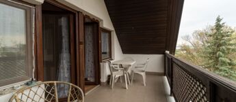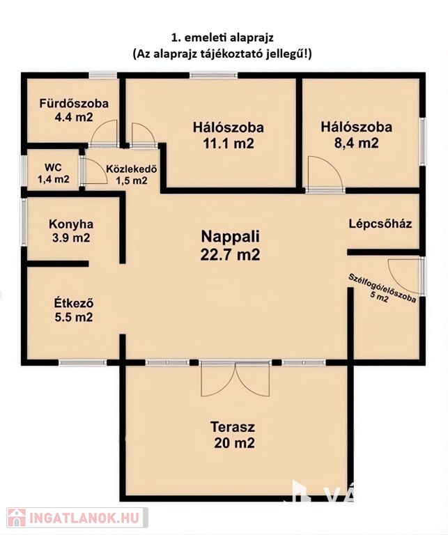 - Felső szint: 3 hálószoba, nappali konyhasarokkal, fürdő és egy második, szintén balatoni panorámás terasz (12 m2).