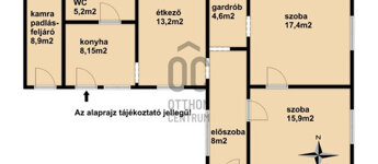 - Helyiségek: 2 szoba, konyha, étkező, előszoba, gardrób, kamra, fürdőszoba-WC.