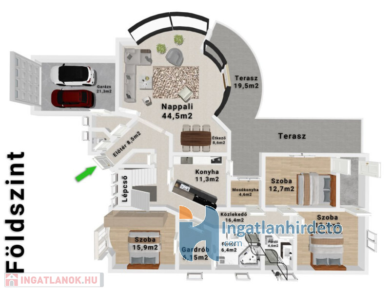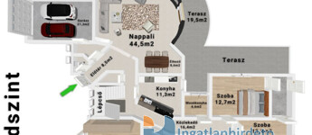 Az ingatlan a fölszinten előtérből, nappaliból, teraszból, konyhából, két fürdőszobából, egy mosókonyhából és 3 szobából áll. A garázsba közvetlenül az előtérből tudunk átmenni.