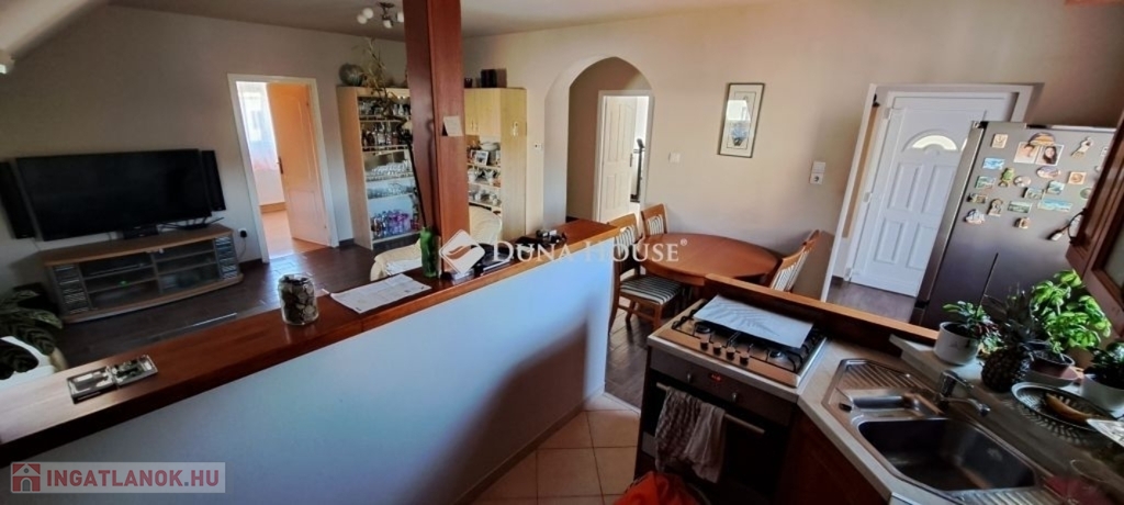 Emeleti lakás: nappali, konyha, étkező, fürdőszoba, 3 hálószoba + 26 nm-es terasz.