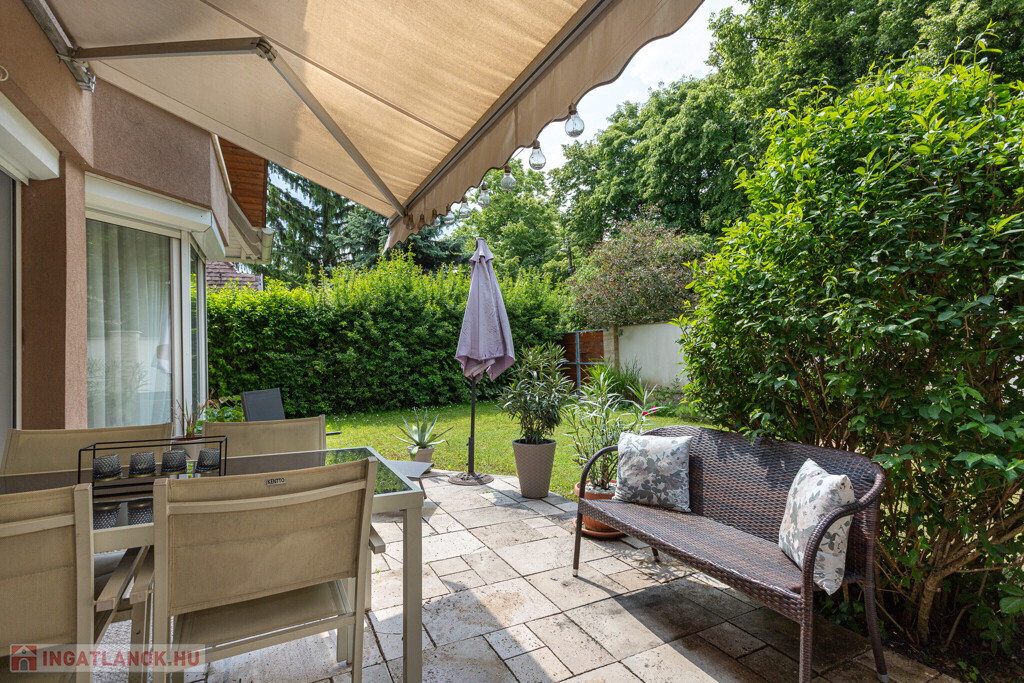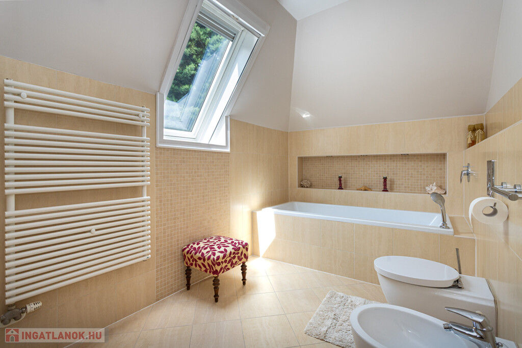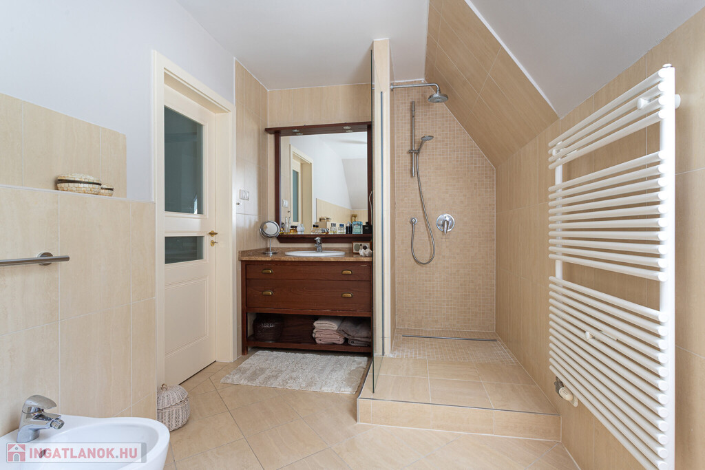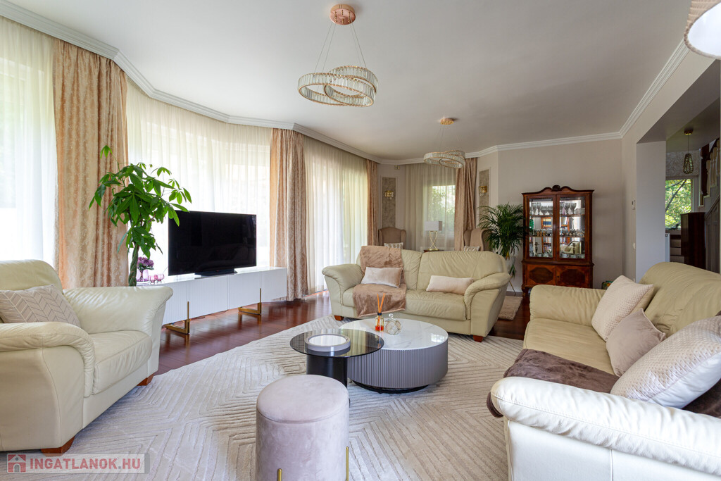 Az ingatlan beosztását tekintve: a földszinten kertkapcsolatos amerikai konyhás nappali, kényelmes vendégszoba, mosdó és gardrób került elhelyezésre; az emeleten 3 tágas hálószoba, melyből az egyik fürdőszoba-kapcsolatos, 2 fürdőszoba, 2 gardróbszoba és közlekedő került kialakításra; az alsó szinten két szoba, fürdőszoba és konyha található terasszal. Az alsó szintnek külön bejárata is van, így tökéletes lehetőség vállalkozásra, vagy egy elszeparált külön bejáratú lakásnak is.