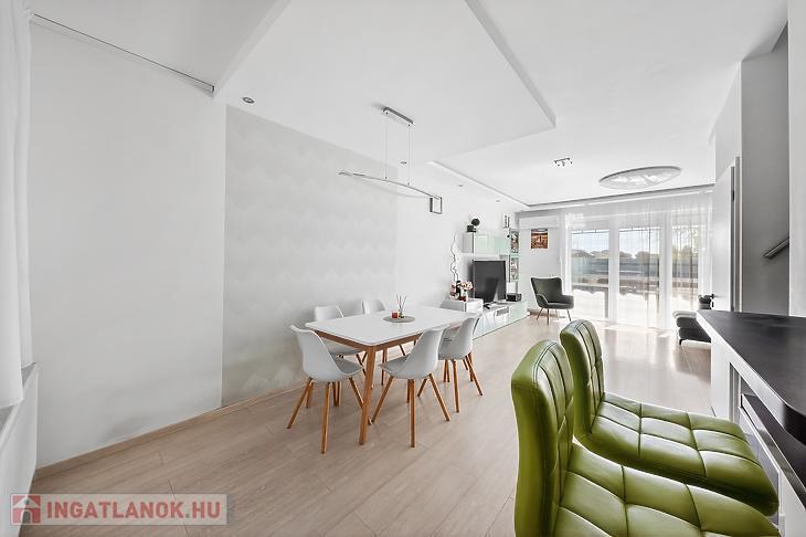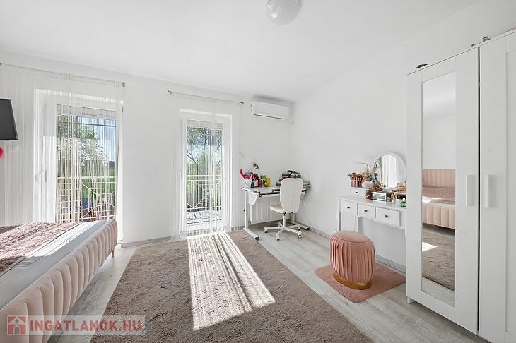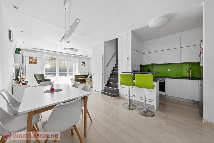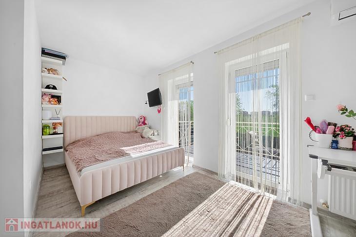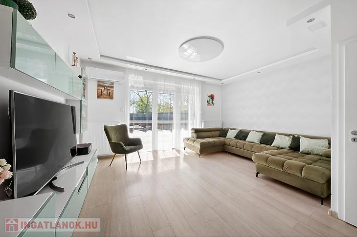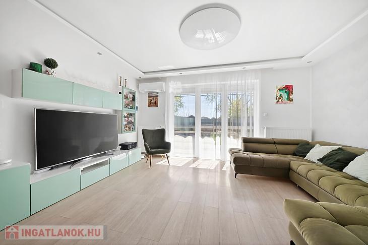 A 111 nm-es lakás (ebből 100 nm fűtött lakótér) egy 190 nm-es telken helyezkedik el, praktikus elrendezéssel. A nappali mellett három külön nyíló hálószoba biztosít kényelmes életteret, így ideális választás családok számára. A világos nappaliból közvetlen kijárat nyílik a hangulatos, műfüves hátsó kertbe, amely holland pázsittal burkolt, gondozásmentes zöld környezetet kínál. Az előkert és a hátsó kert is rendezett, privát teret biztosít a pihenéshez.